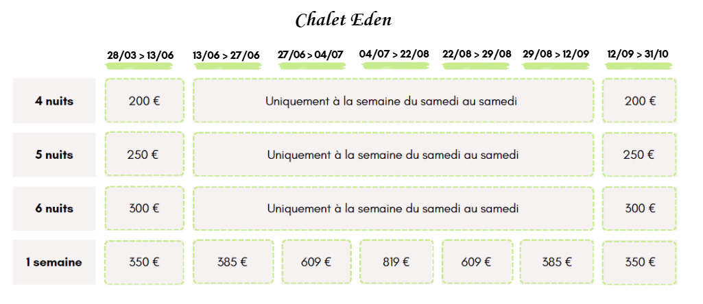 Tarifs 2026 – Chalet EDEN : 2/4 personnes – 2 chambres – 1 lit double + 2 lits simples – cuisine – TV – climatisation