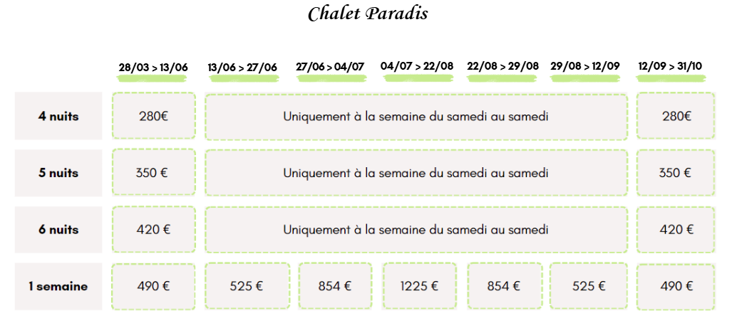 Tarifs 2026 – Chalet PARADIS : 6/8 personnes – 2 lits doubles – 2 lits simples – 1 canapé lit double – 2 sdb – 2 wc – lave vaisselle – TV – Climatisation