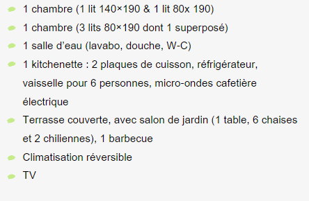 Il s’avère pratique pour les familles nombreuses (3 enfants et +). Vous pouvez aisément installer un lit bébé dans la chambre parents très spacieuse. La chambre enfants est composée de 3 lits (dont 1 superposé).